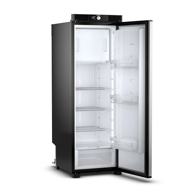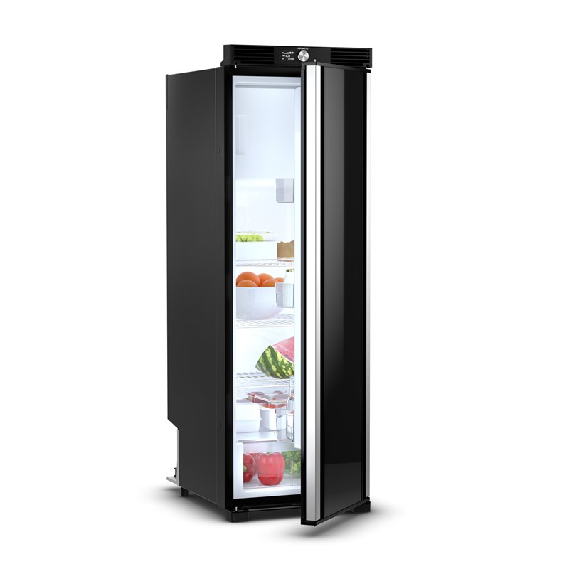 Kompresorová chladnička Dometic RCL 10.4ET, vysoká a štíhla, ponúka pôsobivú kapacitu 157 l. Jej funkčné veko priečinka na udržiavanie čerstvej zeleniny s nastaviteľným ovládaním vlhkosti vzduchu zachová vaše potraviny v priečinku pre ovocie a zeleninu dlhšie čerstvé, pričom zároveň slúži ako doplnková skladovacia polička. Jednoducho použite jedno z dvoch hliníkových madiel po celej dĺžke na otvorenie dverí s dvojitými pántmi doľava a doprava. Mrazničku možno taktiež otvoriť doľava alebo doprava a dá sa jednoducho odstrániť, ak potrebujete viac miesta na položky, ktoré treba vychladiť. Úhľadne integrovaný TFT displej umožňuje ľahké ovládanie nastavení chladničky, ako je tichší nočný režim alebo funkcia rýchleho chladenia.