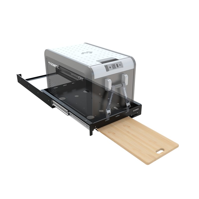 Vhodné pre modely CFX5 35/45, CFX3 35/45, CFX2 37/45 a CFF 35/45 • Integrovaná výsuvná bambusová doska na prípravu potravín, alebo na ich dočasné odloženie • Maximálne vysunutie pre jednoduchý prístup k chladiacemu boxu, nosnosť 90 kg • Predný panel obsahuje integrovaný otvárač na fľaše • Západka sa zaistí, keď je výsuv zatvorený alebo úplne vysunutý, pre bezpečnú jazdu a parkovanie na svahu • Povrchová úprava odolným čiernym práškovým náterom odolným voči poveternostným vplyvom • Montážne príslušenstvo a štyri montážne popruhy Dometic sú súčasťou balenia
