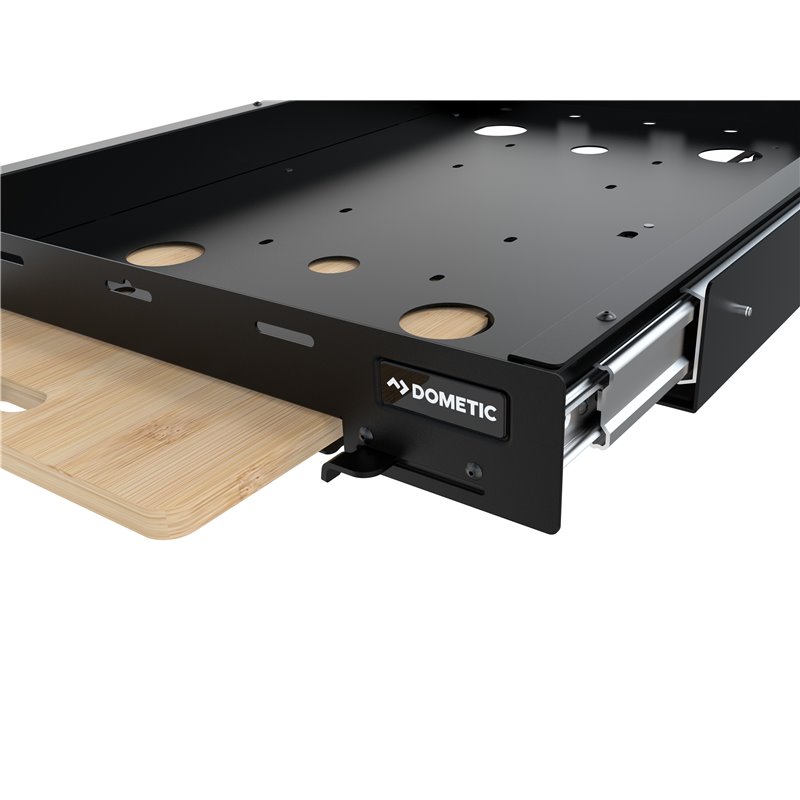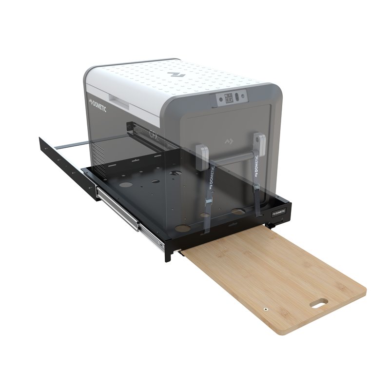 Vhodné pre modely CFX5 55/55IM, CFX3 55/55IM, CFX2 57 • Integrovaná výsuvná bambusová doska na prípravu potravín, alebo na ich dočasné odloženie • Maximálne vysunutie pre jednoduchý prístup k chladiacemu boxu, nosnosť 90 kg • Predný panel obsahuje integrovaný otvárač na fľaše • Západka sa zaistí, keď je výsuv zatvorený alebo úplne vysunutý, pre bezpečnú jazdu a parkovanie na svahu • Povrchová úprava odolným čiernym práškovým náterom odolným voči poveternostným vplyvom • Montážne príslušenstvo a štyri montážne popruhy Dometic sú súčasťou balenia