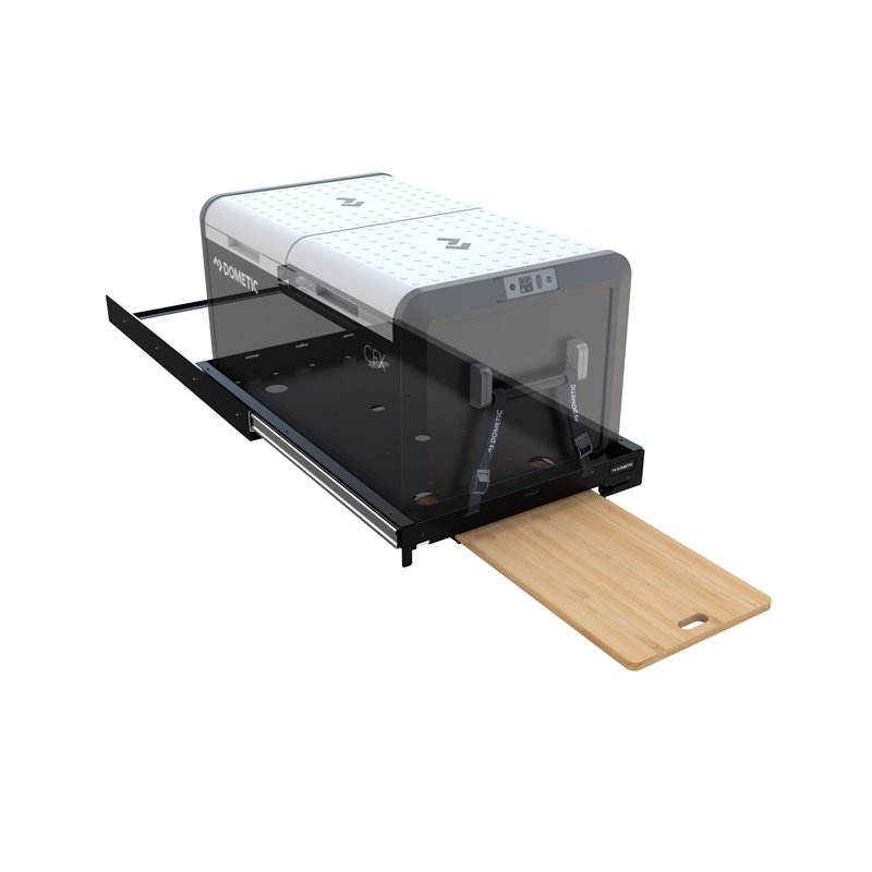 Vhodné pre modely CFX5 95DZ a CFX3 95DZ • Integrovaná výsuvná bambusová doska na prípravu potravín, alebo na ich dočasné odloženie • Maximálne vysunutie pre jednoduchý prístup k chladiacemu boxu, nosnosť 113 kg • Predný panel obsahuje integrovaný otvárač na fľaše • Západka sa zaistí, keď je výsuv zatvorený alebo úplne vysunutý, pre bezpečnú jazdu a parkovanie na svahu • Povrchová úprava odolným čiernym práškovým náterom odolným voči poveternostným vplyvom • Montážne príslušenstvo a štyri montážne popruhy Dometic sú súčasťou balenia