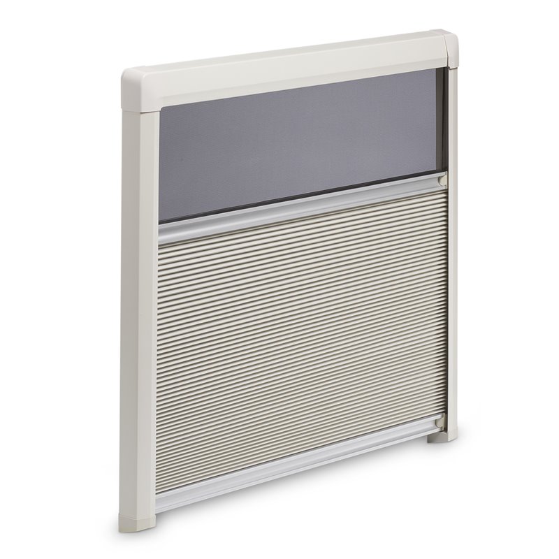Nový štýl – je v harmónii s modernými modelmi vozidiel • Tieniaca roleta so sieťkou proti hmyzu sa dá samostatne nastaviť • Dvojitý plisovaný materiál v tvare včelieho plástu pre vynikajúcu tepelnú izoláciu • Je zostavená už vo výrobe a je vhodná pre väčšinu okien obytných vozidiel. Dá sa však vyrezať a prispôsobiť tak na okná iných veľkostí • Maximálne zorné pole vďaka štíhlym profilom • Žiadne viditeľné skrutky • Napnutie rolety a sieťky proti hmyzu bez potreby použitia nástrojov
